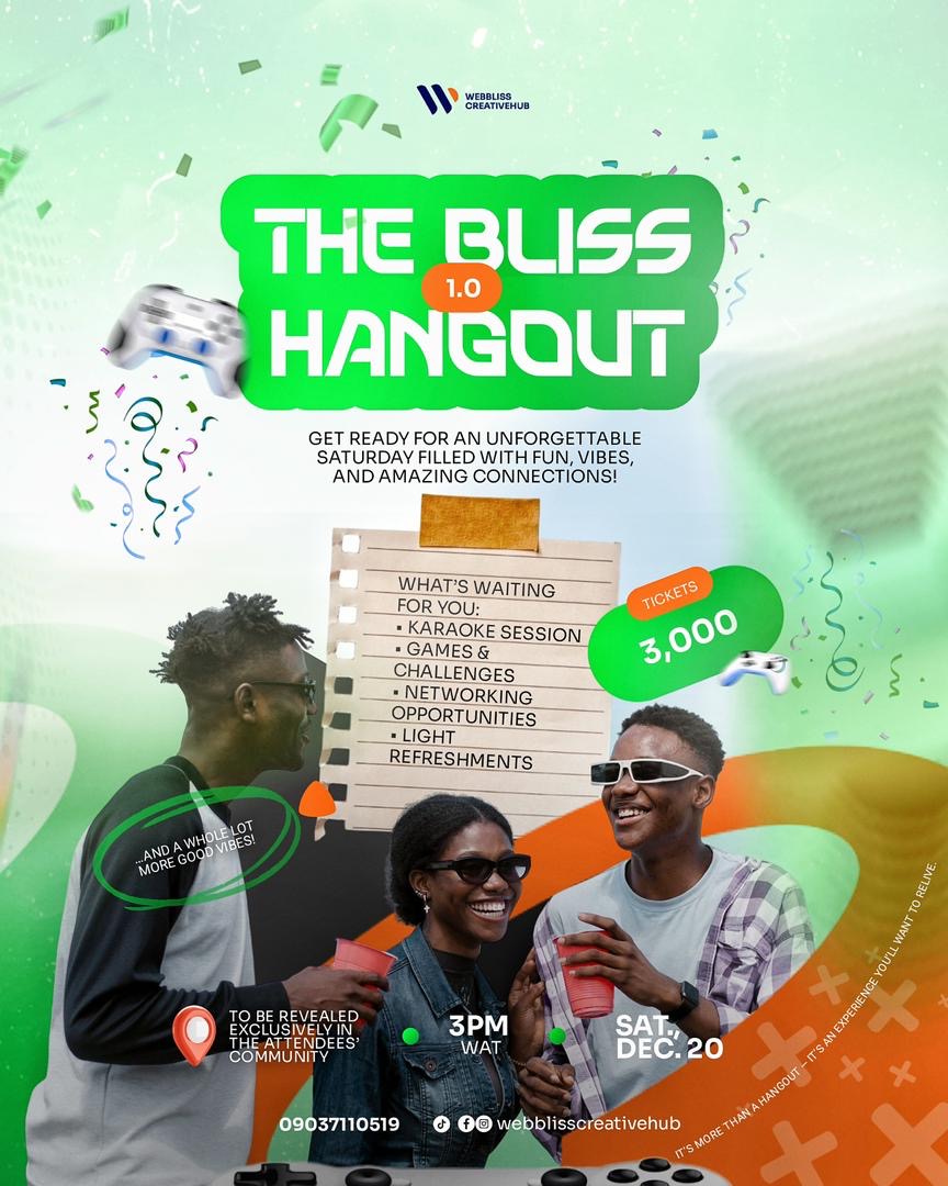 Get ready for *The Bliss Hangout 1.0*, an exciting Friday experience powered by Webbliss Creative Hub! 🎉 Join a vibrant community for an unforgettable afternoon of fun, games, karaoke, networking, and pure good vibes. Expect engaging challenges, refreshing treats, and meaningful connections in a relaxed, creative environment. Whether you're coming to unwind, meet new people, or just have a great time, this event promises a full dose of energy and joy. #TheBlissHangout #GoodVibesOnly